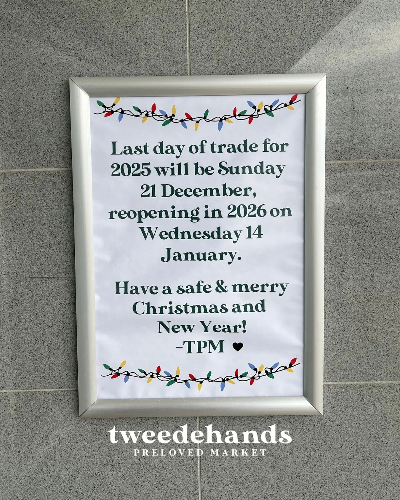 Tweedehands’ last day of trade for 2025 will be Sunday 21 December, reopening after the Christmas break on Wednesday 14 January. Have a lovely and safe Christmas and New Years.